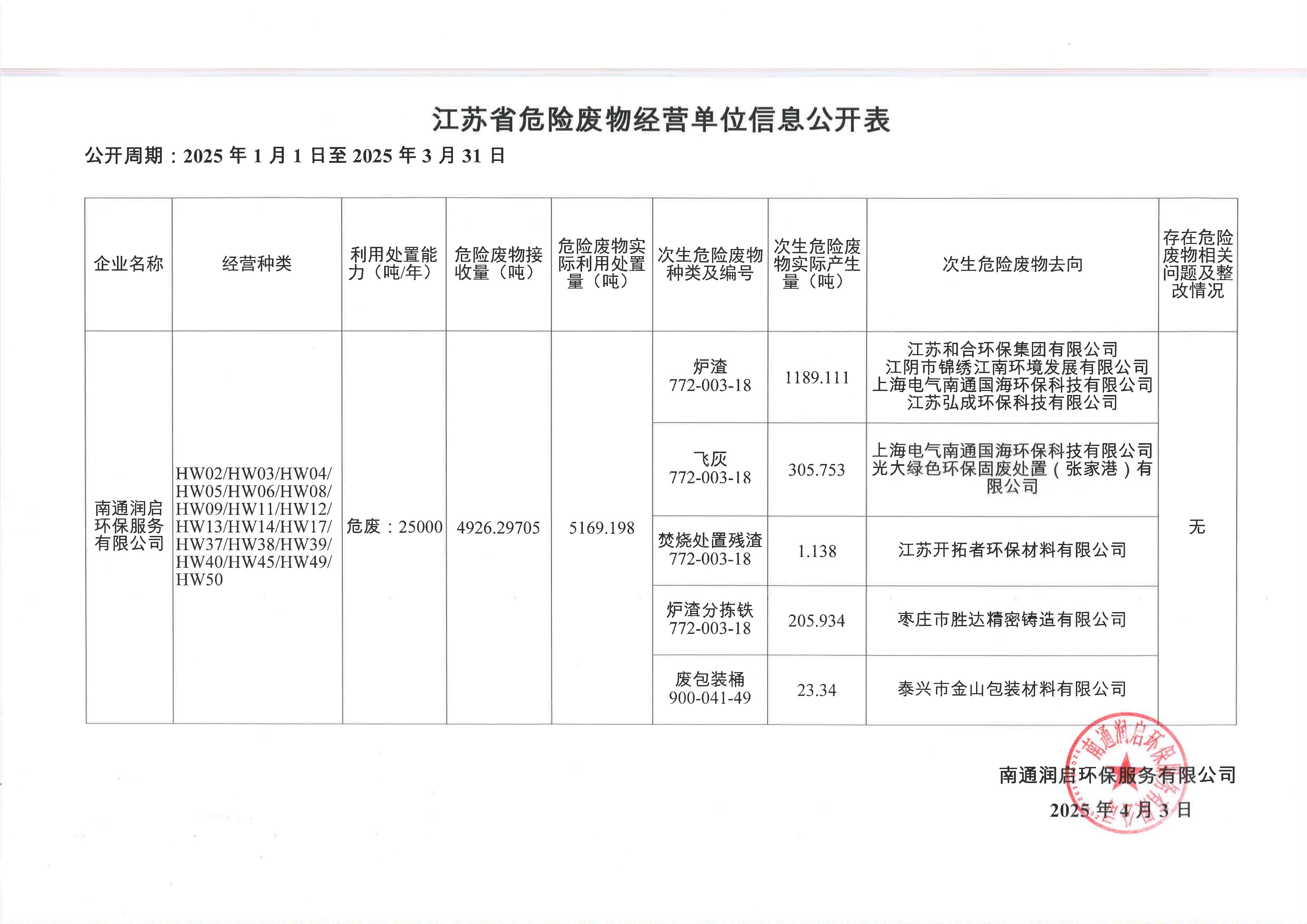 江蘇省危險(xiǎn)廢物經(jīng)營(yíng)單位信息公開(kāi)--潤(rùn)啟公司2025年第一季度